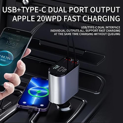 [Retractable car charger]:The car USB charger has 2 retractable charging cables. Pull twice or pull it to the end, the cable will go back position.It can charge two mobile phones at the same time whether you are sitting in the driver's seat,co-pilot seat or rear seats.