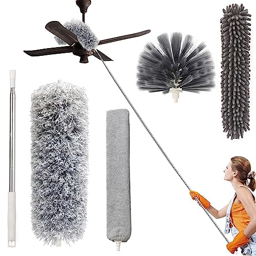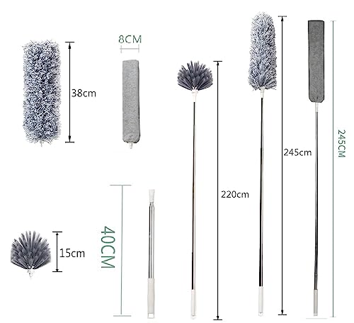 CAN REACH HIGH CEILINGS: This telescoping microfiber duster with a extra long pole, can reach 100 inches when fully extended, easy to clean ceilings,cobwebs,walls, ceiling fans, and lamps. No more chairs or dangerous ladders to climb on. With the extendable pole, you can easily reach high surfaces such as ceilings, fans, and photo frames without the need for ladders or standing on chairs.