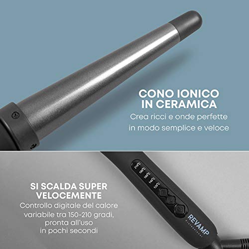 REVAMP Progloss Big Hot Wand, Ferro Arricciacapelli Conico in Ceramica con Tecnologia Ionica per Onde e Ricci Definiti, Infuso con Oli Protettivi, Diametro 32-19 mm, Temperatura 120°C-210°C, Nero