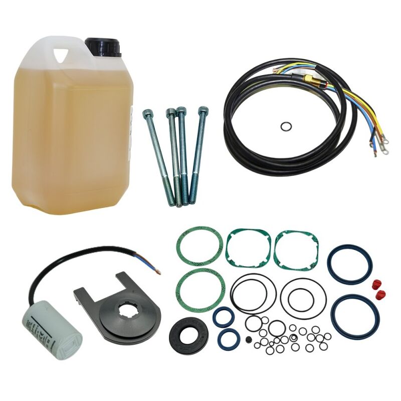Bft kit revisione base per riparazione motore sub interrato il kit comprende. 2 lt olio oleodinamico i101151 1 cavo elettrico i099414 1 kit copertura albero sub i099416 1 condensatore 6,3 mf i100122 10001 2 viti b-pass rosse 1100007 10010 4 viti lunghe accoppiamento i100020 10010 1 kit gurnizioni complete i300063 1000