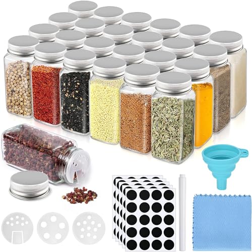 Revivoer Barattoli Portaspezie Vetro, Set di 24 Barattoli Spezie con Coperchio, Trasparente Contenitori Spezie Vasetti Portaspezie Vetro (120ml) per Cucina con Etichette Spezie (Argento)