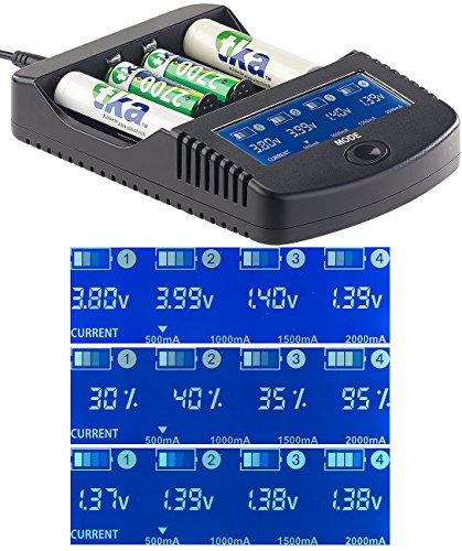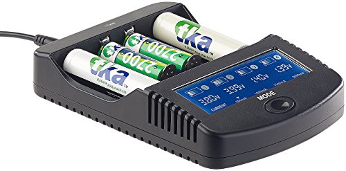 simultanea ricarica di batterie di diverse capacità e dimensione Grande display LCD con indicatore discreto per ogni ricarica chacht: mostra tensione, corrente di carica, capacità in% sicuro singolo alloggiamento di monitoraggio con caricatore rapido di batteria rilevamento difetto, protezione da sovraccarica, surriscaldamento e cortocircuito Include alimentatore e istruzioni in lingua tedesca