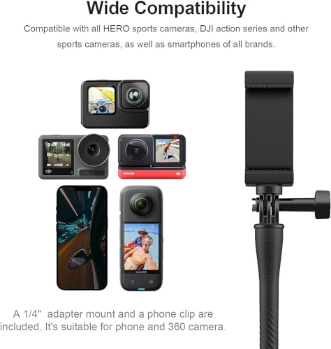 【Compatibilità ampia】 Funziona per smartphone fino a 4,3" di larghezza come iPhone 14/14 Pro/13/13Pro/12/12 Pro /iPhone 11 /11 Pro/ XS/XS Max/XR/8/8 Plus/X/7 Plus/6s Plus/6s/6 Plus/6 e Samsung. Con filettatura standard da ¼ di pollice per Insta360 e adattatore per GoPro Max, GoPro 11 Mini, Go Pro Hero 11 10 9 8 7 6 5 4, DJI Osmo Action, DJI Action 2 3, DJI Osmo Pocket 2 3, Dragon Touch, APEMAN, Crosstour, XiaoYi, Apexcam, VEMONT, AKAIRIO e S