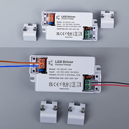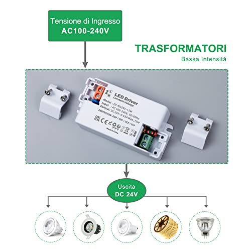 Trasformatore LED a tensione costante di classe II, piccolo trasformatore CC, ingresso CA 100-240V, uscita CC 24V 630mA, carico massimo 15 watt, 50/60 Hz.