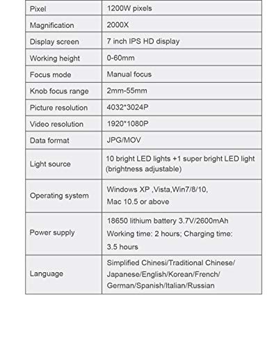 Il pacchetto include: 1 x microscopio 1 x obiettivo multiplo basso 1 x obiettivo multiplo alto 1 x manuale (inglese) 2 x diapositiva 2 x cavo dati 1 x panno per la pulizia