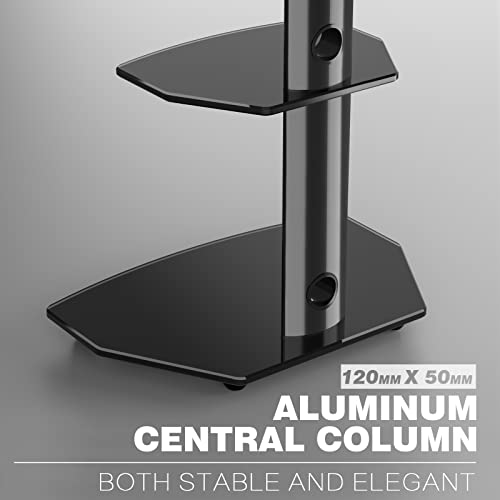 SUPPORTO ROBUSTO CON STOCCAGGIO - Dimensioni del prodotto 60 (L) x40 (L) x 131,7 (H) cm. Questo supporto TV è realizzato in robuste colonne di alluminio che possono trasportare televisori che pesano fino a 50 kg. Nel frattempo, scaffali in vetro temperato sufficientemente ampi da offrire spazio per i tuoi accessori per audio video, lettori Blu-Ray e DVD, decoder via cavo, consolle satellite, XBox, console di gioco, ecc.