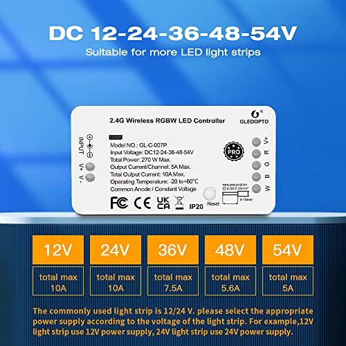 Smart LED RGBW Strip Light Controller-Controller LED DC. Potenza: Per un massimo di 15 Ampere, corrisponde a una striscia LED con lunghezza fino a 50 metri. Ciò significa che il popolare controller LED è in grado di gestire senza problemi 6A. Un dimmer RGBW facile da installare.