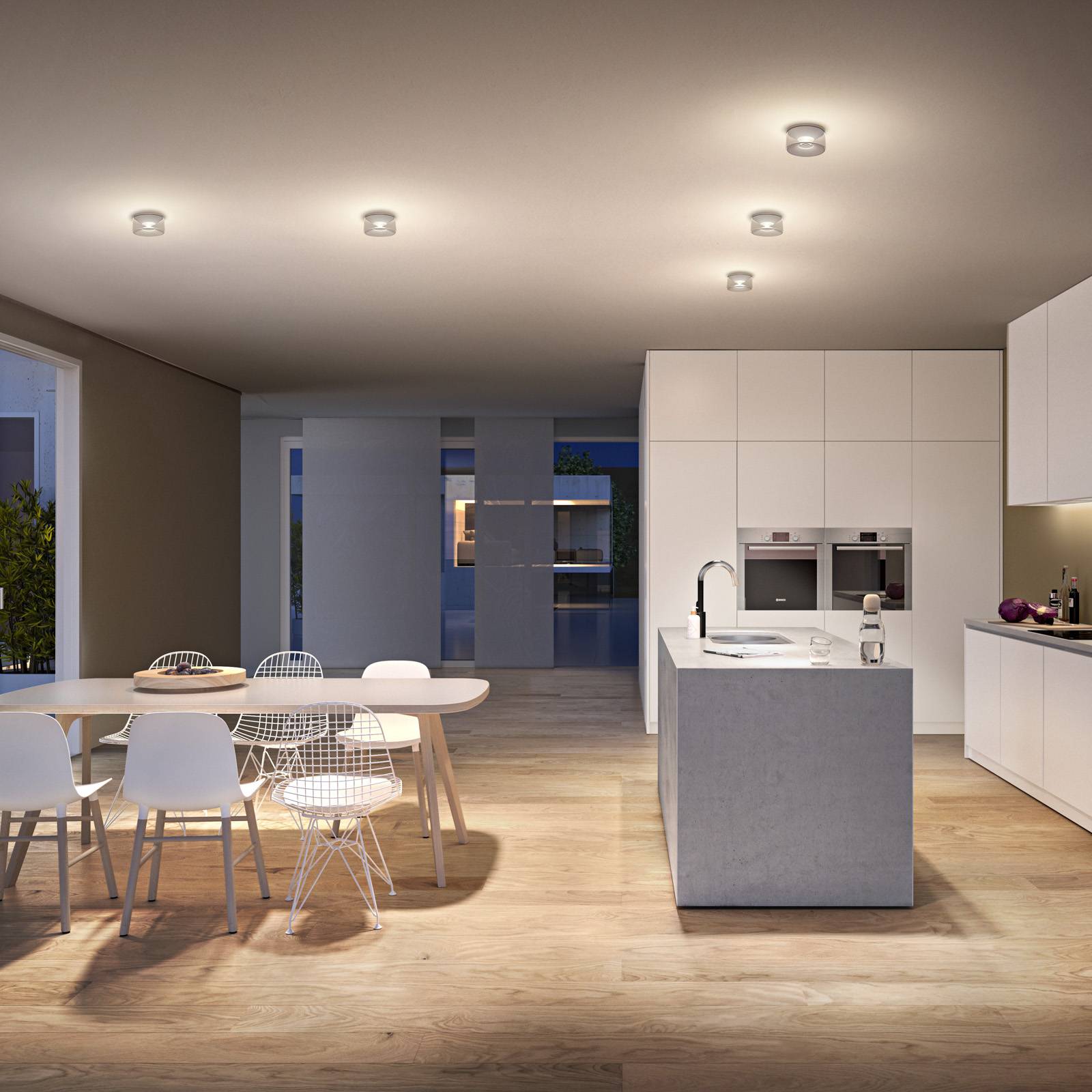 Luce diretta brillante con eccellente qualità della luce e illuminazione del soffitto - apparecchio a soffitto Vior LED con 2.700 KAT Il moderno apparecchio a soffitto Vior LED è una soluzione di illuminazione universale per un'ampia varietà di ambienti. La forma cilindrica di base è costituita da una base in alluminio pressofuso con una copertura laterale in plastica PMMA trasparente. La luce bianca calda è emessa da un sofisticato sistema di controllo della luce brevettato che utilizza una lente e un riflettore a microfaccia, ottenendo una luce diretta particolarmente poco abbagliante e una discreta illuminazione indiretta sul soffitto. Inoltre, l'emissione luminosa può essere controllata esternamente con dimmer a taglio di fase. Vior è adatto non solo per l'illuminazione di aree e di sale di ricevimento e di ricreazione, ma anche per gli uffici, grazie all'eccellente controllo dell'abbagliamento, e per i locali umidi e le aree di ingresso, grazie alla protezione dagli spruzzi d'acqua.