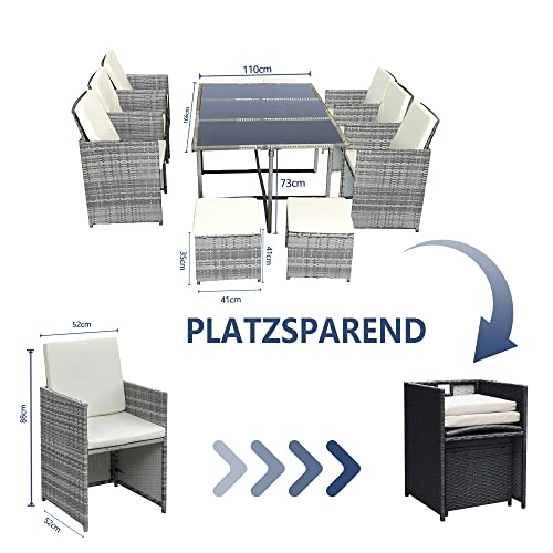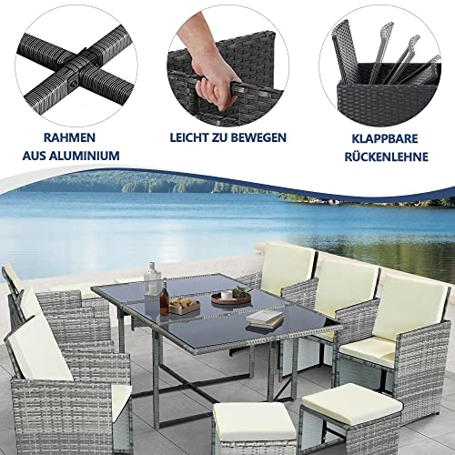 Ribelli Set di mobili da Giardino 11 Pezzi, Set Salotto, Cuscini - in PE Rattan - Tavolo più Sei sedie e Quattro sgabelli Pratico da riporre, colorazione:Grigio/Crema