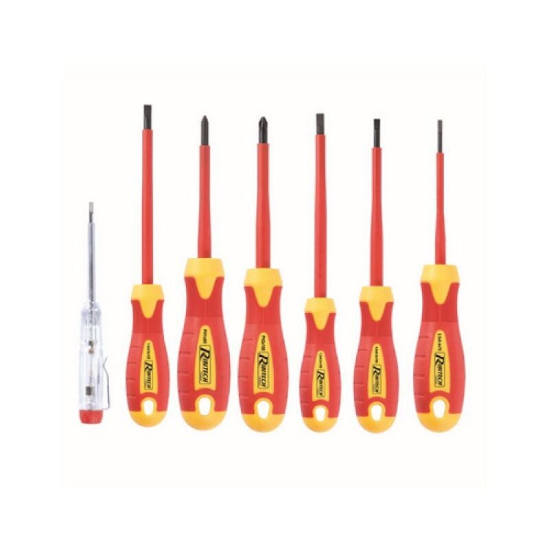 Set di 6 cacciaviti da elettricista e 1 cacciavite tester. Lama in cromo vanadio con testa magnetica e guainda di protezione. Composto da: 4 cacciaviti per viti a taglio 2,5 x 75 mm, 4 x 100 mm, 5,5 x 125 mm, 6,5 x 150 mm. - 2 Phillips: PH1 x 80 mm. PH2 x 100 mm. 1 cacciavite tester: voltaggio 110-250 V. Frequenza 50 500Hz. (DianFlex) 2,5 - 4 - 5,5 - 6,5 - PH1 PH2