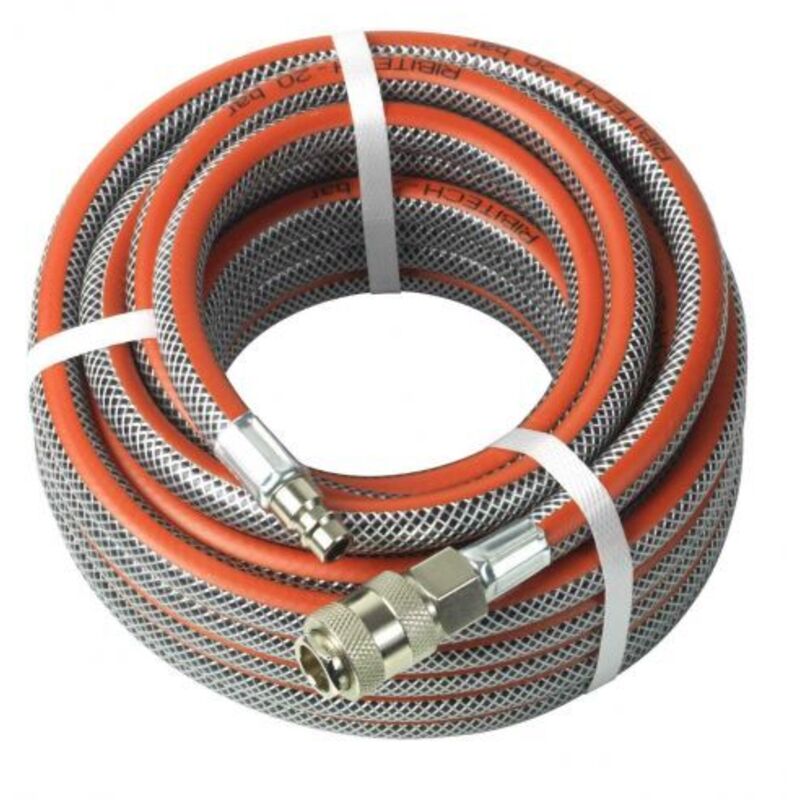 Tubo per aria compressa con raccordi ad innesto rapido inclusi. Disponibile il modello da 10 o 15 metri con un cambio delle dimensioni a seconda della scelta. Ottimo per compressori e utensili pneumatici in genere. Tubo aria - Ø 8mm x 13mm x 10mt In PVC con raccordi femmina universali e raccordi maschi standard D. Pressione max. 20 bar - pressione di scoppio 60 bar. Ø 8 mm x 13 mm x 10 m Tubo aria - Ø 10mm x 17mm x 15mt In PVC con raccordi femmina universali e raccordi maschi standard D. Pressione max. 20 bar - pressione di scoppio 60 bar. Ø 10 mm x 17 mm x 15 m Prodotto assolutamente Made In Italy