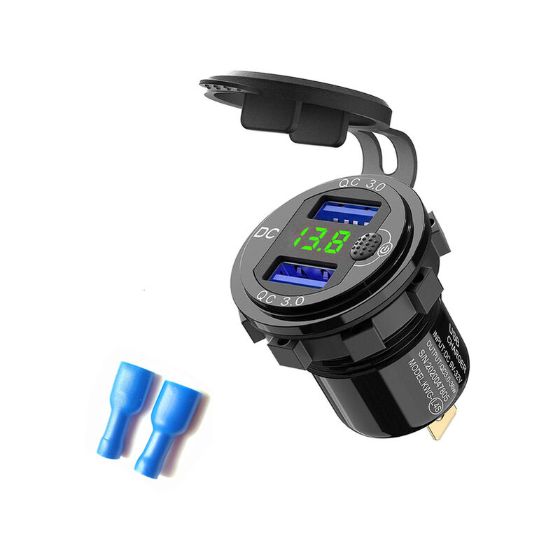 Specifiche di prodotto:Colore: NeroVoltmetro LED colore: bluMateriale: lega di alluminio + ABSTensione di ingresso: DC 9-32VTensione di uscita: DC 3.6-6.5V/3A, 6.5V-9V/2A, 9V-12V/1.5ADimensione del prodotto: 1.45x1.92 polliciDimensione portaforio: 1.13 polliciUscita massima: 36W(18W ciascuno)Cornici E Articoli Da Esposizione Includono:Caricabatteria da auto Dual USB QC3.0 1 *Fili da 1*60cm con fusibili 10A (opzionale)Note1. La tensione visualizzerà collegando alla batteria.2. La serie iPhone non supporta la ricarica rapida, la ricarica dell'iphone è normale.3. Per telefoni cellulari che supportano la ricarica rapida, è necessario utilizzare il cavo di ricarica originale o il cavo di ricarica rapida per ottenere una ricarica rapida.4. Per i veicoli, è consigliato per ottenere l'alimentazione dalla scatola dei fusibili, mentre per la moto, si collega meglio ai fili dell'interruttore a chiave.