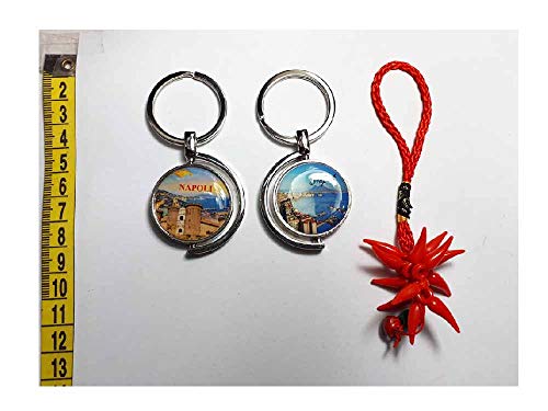 Ricevi 2 PORTACHIAVI panorama vesuvio napoli alto 8 cm circa metallo girevole con 2 foto diametro 35mm double face, + un ciondolo corni amuleto horn charms lucky gobbo scio napoletani napoli