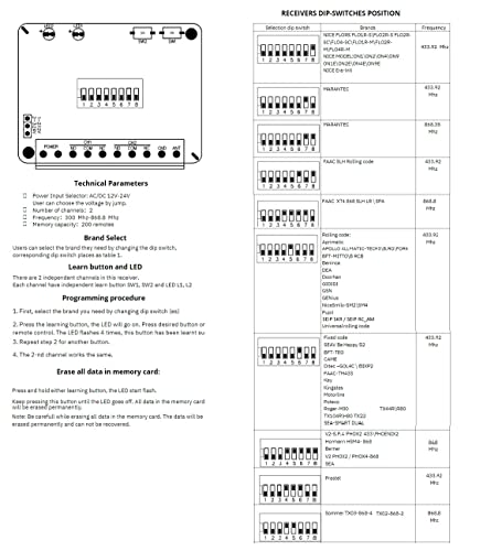 Ricevitore radio compatibile con Berner 868,3Mhz BHS110, BHS121 (Not BDS120), BHS130, BHS140, BHS153, BHS211, BHS221. Ricevitore a 2 canali, Rolling & Fixed Code 300-868mhz 12-24VAC/DC