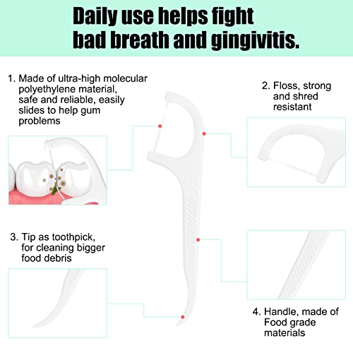 Manico antiscivolo: il manico in HIPS alimentare è sicuro, robusto e antiscivolo, offrendo una presa confortevole e facile da usare. La punta del filo interdentale è stuzzicadenti, ideale per rimuovere i detriti più grandi.