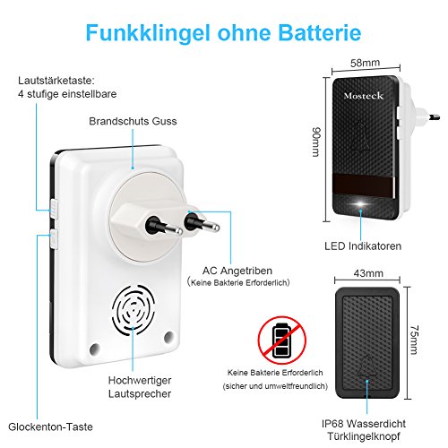 【 Alta qualità & impermeabile IP68 】 Il campanello senza fili di Mosteck è realizzato in materiale ABS di alta qualità, atossico, innocuo e riciclabile. Il materiale può proteggere dalla pioggia e dalle alte temperature. La tecnologia di tenuta garantisce la perfetta potenza del trasmettitore in condizioni climatiche avverse. Il trasmettitore funziona normalmente anche se immerso in acqua. Consigliamo questo campanello radio a persone che spesso hanno bisogno di un campanello senza fili impermeabile.