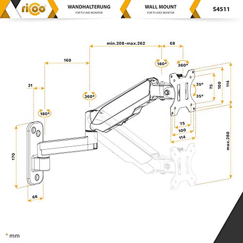 : Porta TV snodabile per televisione piatta è orientabile +/-90 gradi. Inclinazione regolabile da +/-35 gradi. Braccio con distanza dalla parete da 99-521mm. Regolazione ottimale, il pannello frontale è rotante di 360 gradi