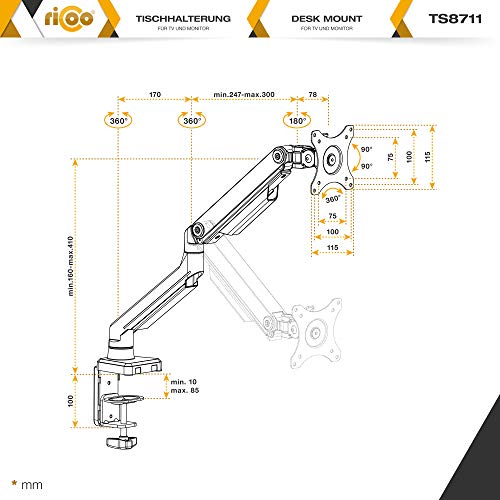 RICOO Supporto monitor scrivania TS8711 Girevole Inclinabile Schermi 15-30" (38-76 cm) Braccio schermo PC Staffa universale VESA 75 x 75 100 x 100