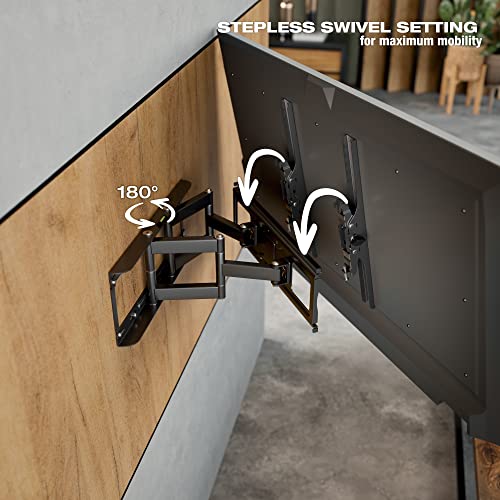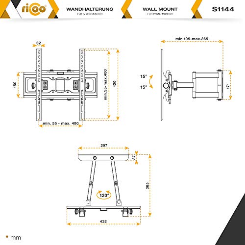 : Porta TV snodabile per televisioni è orientabile 120 gradi, se la larghezza dello schermo è 55cm max. Inclinazione regolabile da +/-15 gradi. Braccio con distanza dalla parete da 105-365mm