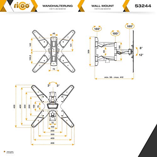 : Porta TV snodabile per televisioni è orientabile 180 gradi, se la larghezza dello schermo è 74cm max. Inclinazione regolabile da +12/-8 gradi. Distanza dalla parete 58-412mm