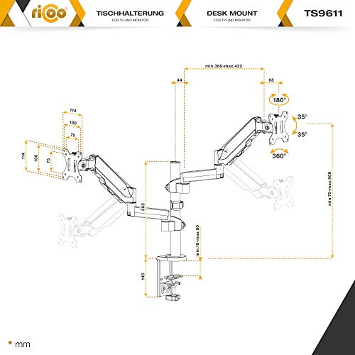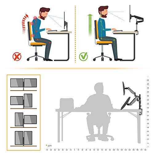 : Stand monitor doppio da tavolo è orientabile 180 gradi. Sostegno con inclinazione flessibile da +/-35 gradi. Rotazione de pannello frontale a 360 gradi. Altezza della base è regolabile