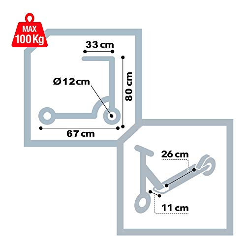 Dimensioni ruote: il monopattino ha 2 ruote in PVC da 12,5 cm di diametro, dimensioni dello scooter: 67 x 33 x 80 cm e base da 26 cm di lunghezza x 11 cm di larghezza