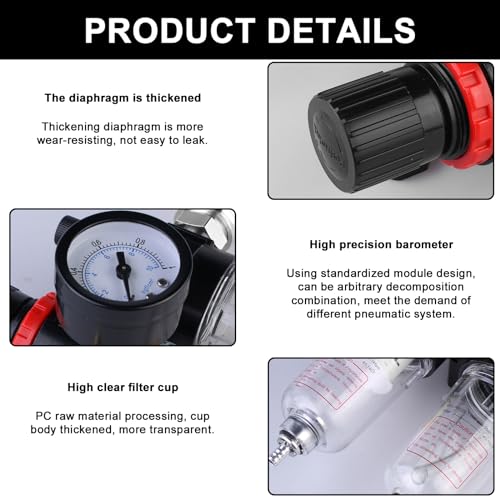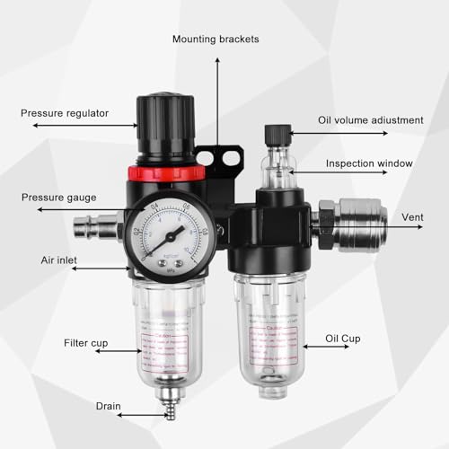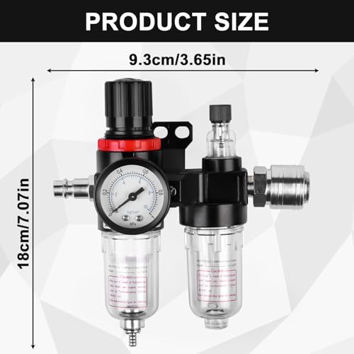 Materiale di alta qualità: il riduttore di pressione dell'aria compressa è un efficiente accessorio di manutenzione con filtro e separatore d'acqua, con raccordi rapidi e manometro, connettore filettato interno da 1/4" per collegare il compressore ad aria compressa.
