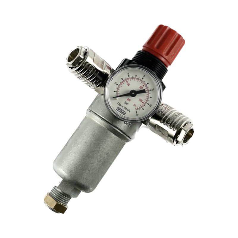 Riduttore di pressione per compressore ABAC BALMA FIAC e tutti gli altri compressori. CONNESSIONI: 3/8” Maschio - N°2 rubinetti rapidi di linea CARATTERISTICHE GENERALI Regolatore di pressione con manometro tondo Ø 40 mm, scala 0÷10 bar / 0÷140 psi . Corpo in alluminio. Con N°2 rubinetti rapidi di linea Ingresso aria con filettatura 3/8” Maschio Sistema di regolazione della pressione a pistone Pomello di regolazione munito di sistema di bloccaggio e ghiera di fissaggio in tecnopolimero Valvola di scarico per sovrapressioni, funzione relieving, di serie. Cartuccia filtrante in bronzo sinterizzato che trattiene impurità