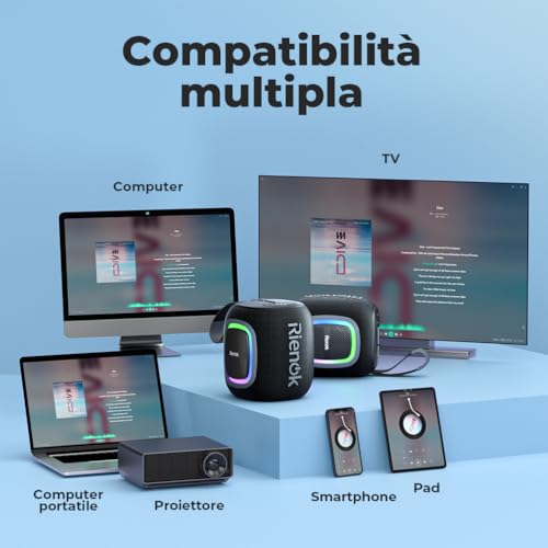 Vero stereo senza fili. Collegate due RIENOK S2 cassa bluetooth per ottenere un suono surround stereo a due canali. Collegare due speaker bluetooth da 5W per ottenere un effetto da 10W. Le luci RGB su entrambi i lati del cassa bluetooth regalano un'esperienza diversa al vostro divertimento musicale quotidiano. Idee regalo natale uomo donna.