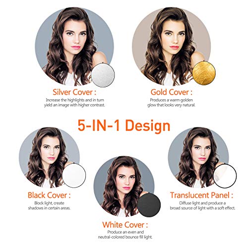 Il kit riflettore 5 in 1 include: 1 pannello traslucido con 4 cover (argento, oro, bianco e nero), 1 morsetto per riflettore fotografico.
