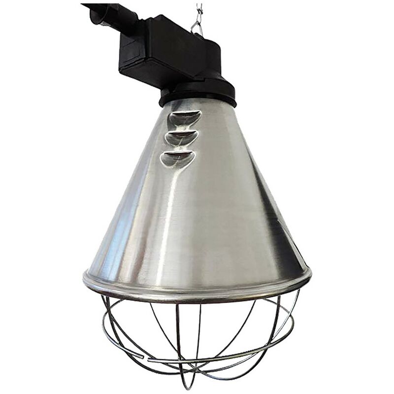 Apparecchio indispensabile per garantire calore a piccoli animali di varie specie che necessitano di tepore per i primi tempi dopo la nascita. copertura in alluminio ø 21 cm, completo di catena fissaggio (forza di trazione max. 20 kg). a 6 fessure di ven