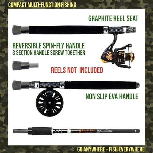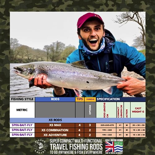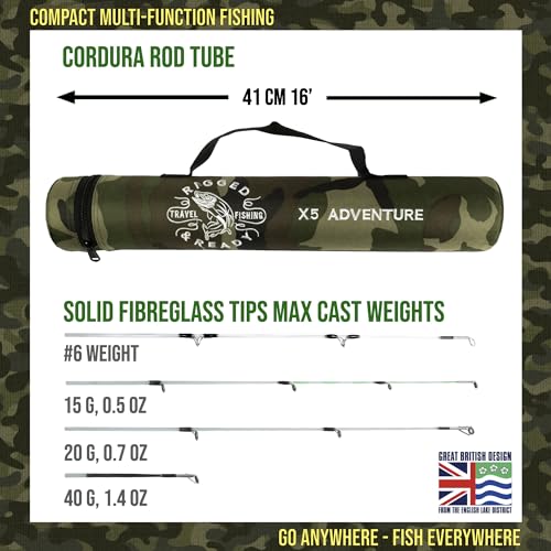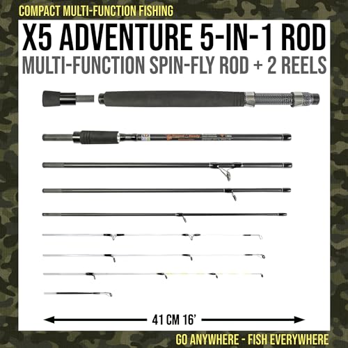 Rigged and Ready X5 ADVENTURE Canna da pesca da viaggio. Canna da viaggio super compatta. 1 canna 5 opzioni di pesca. 2,2 m (7' 2") + 1,9 m (6'3") lunghezze. La rotazione multifunzione, baitcast,