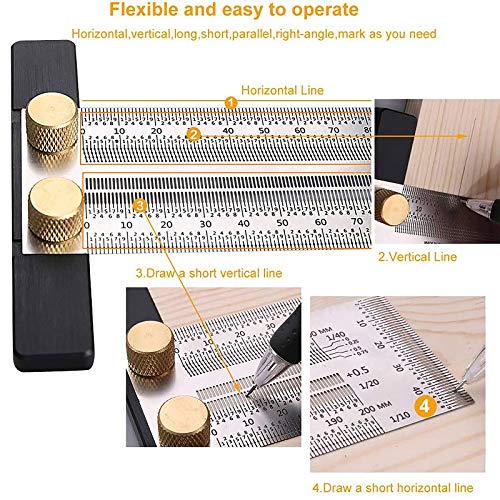Materiale premium: il righello è realizzato in acciaio inossidabile, con lavorazione di precisione, scala trasparente. La manopola verticale di regolazione fine utilizza dadi zigrinati in rame puro per un facile utilizzo. Robusta e resistente, la scala di precisione quadrata per la lavorazione del legno è chiara e precisa, rende la marcatura molto meno dispendiosa e molto più accurata.