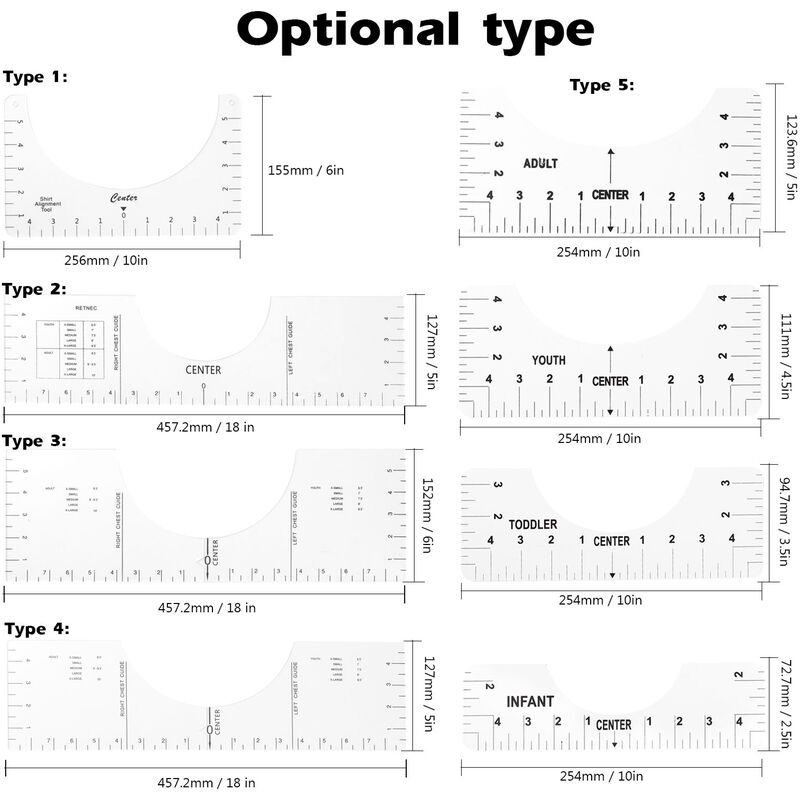 Questo strumento di progettazione della maglietta è molto utile quando si allinea il disegno con la maglietta, è sufficiente allineare il righello al colletto della maglietta per centrare il disegno prima di premere. Caratteristiche: Il righello per magliette è un modo semplice e veloce per provare gli strumenti di allineamento della maglietta in varie dimensioni. Guida righello progettata per allineare con precisione i tuoi disegni su magliette di dimensioni multiple. Tabella delle taglie incisa per un uso duraturo. Non si sbuccia né si sbiadirà. Realizzato in materiale pratico e trasparente, inciso con precisione. Archiviazione portatile e facile. Questo strumento copre tutte le aree del collo per una misurazione precisa. Specifiche: Tipo: 1,2,3,4,5 (opzionale) Materiale: acrilico Colore: trasparente Tipo 1: Dimensioni: 256 * 155 mm / 10 * 6 pollici Peso dell'articolo: 64 g / 2,3 once Formato del pacchetto: 276 * 175 mm / 10,9 * 6,9 pollici Peso del pacchetto: 85 g / 3,0 once Tipo