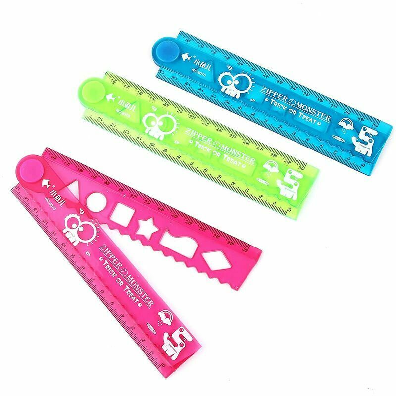 Lunghezza: questo metro pieghevole in plastica misura 30 cm/11,8" lungo ed è piegato 15 cm / 5.9" lungo. Design: questi righelli multifunzionali in plastica sono progettati in 3 colori vivaci e stampati con graziosi motivi che i bambini adorano usare. Materiale: questi righelli geometrici a doppia faccia sono realizzati in plastica di alta qualità, flessibile, resistente, non tossica e non facile da sbiadire.I numeri sul righello sono chiari, facili da leggere e facili da misurare.Possono servirti a lungo. Modello: la piegatura del righello può non solo essere dritta e ondulata Disegna linee su entrambi i lati, ma anche disegnare cerchi, quadrati, stelle, ecc. in base alla grafica mostrata sul righello.