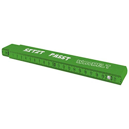 La consegna include: 1 metro TOX da 2 m con stampa Sits Fits Wobbles, con funzione di misurazione degli angoli e numeri decimali colorati, metro pieghevole in legno di faggio di colore verde, classe di precisione III.