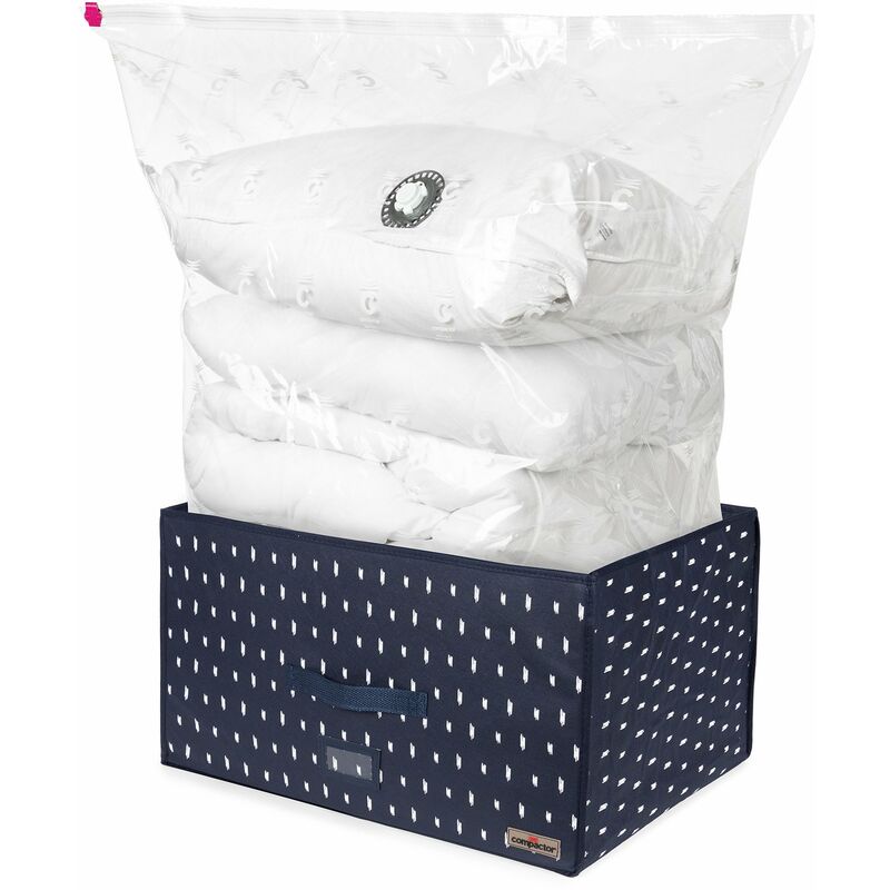 Scatola rigida per la conservazione sotto vuoto, pronta all'uso Risparmiate 3 volte più spazio negli armadi Riempire, chiudere, aspirare: è facile! Prodotto in Spagna Utilizzabile con qualsiasi tipo di aspirapolvere dotato di tubo flessibile Riutilizzabile fino a 100 volte Questo contenitore sottovuoto con sacchetto di compressione per il bucato integrato vi farà risparmiare fino al 75% di spazio in più nei vostri armadi! Come per magia, la tecnologia Compactor rimuove l'aria dalle fibre tessili con una semplice aspirazione. Senza subire danni, gli abiti e i tessuti ingombranti vengono compressi e perfettamente protetti da polvere, tarme, acari e umidità. È la soluzione ideale per liberare spazio, organizzare gli scaffali, fare ordine a ogni cambio di stagione e facilitare la conservazione quotidiana. Questa scatola rigida è rivestita in polipropilene non tessuto 100% blu indaco stampato con piccoli motivi bianchi nello spirito della tessitura giapponese. È dotato di un coperchio, di