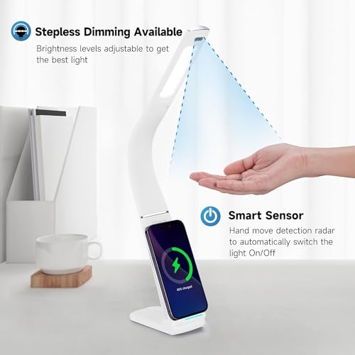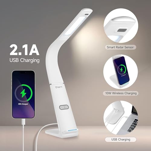 Rigors Lampada da Scrivania Smart Gesture Sensor, 10W Ricarica wireless und ricarica USB, Lampada da Tavolo Dimmerazione continua, lampada scrivania Regolazione a 270° del braccio della lampada