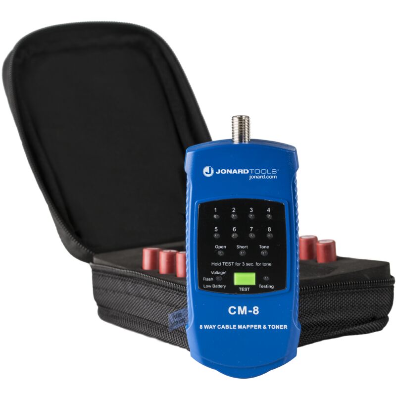 L'apparecchio è ideale per controllare e identificare il cavo dell'antenna, per controllare il cavo COAX, per il CCTV-Kabel-Mapper CM-8. Das Set enthält 8 Standard-RG6-Anschlüsse.