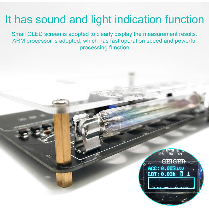 Questo rilevatore di radiazioni nucleari è in grado di rilevare raggi X, raggi γ, raggi X β in grado di rilevare la dose radioattiva di marmo, giada, prodotti marini Amoy, iodio 131, vari minerali sconosciuti per la decorazione. Questo è un contatore geiger fai-da-te semplicemente assemblato. Se sei interessato a questo prodotto, vieni a provare, non ti deluderà. Caratteristiche: Due modi di allarme: questo rilevatore di radiazioni nucleari ha una funzione di indicazione del suono e della luce, i risultati ti avviseranno in tempo. Strumento multifunzione: ha le funzioni di dose in tempo reale, dose media, dose cumulativa, grafico di tendenza, ecc. Schermo OLED: viene adottato un piccolo schermo OLED per visualizzare chiaramente i risultati della misurazione, è possibile visualizzare i dati in modo più chiaro. Viene adottato il processore ARM, che ha una velocità operativa rapida e una potente funzione di elaborazione. Ampie applicazioni: questo rilevatore di radiazioni nucleari è in