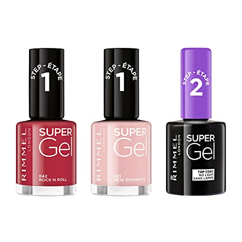 Rimmel London Set Smalti Unghie Super Gel, Nail Polish Effetto Gel a Lunga Durata, 001 Top Coat, 021 New Romantic, 042 Rock N Roll