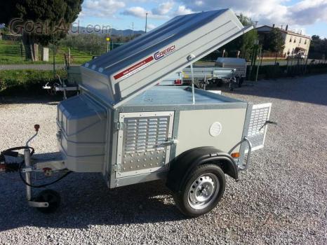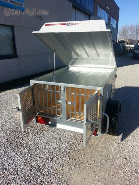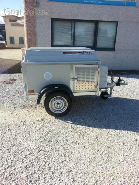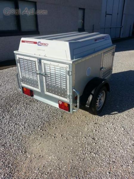Trasporto cani CRESCI TC4 nuovo da immatricolare. nuovo modello 4 comparti con cancelletto interno, gavone anteriore portaoggetti, spazio di carico sotto il coperchio, freno a repulsione meccanica con sblocco autoreverse per retromarcia, sospensione a barra di torsione su gomma a ruote indipendenti, impianto luci a nuova normativa comprensivo di retromarcia, telaio profilato di lamiera grosso spessore zincata a caldo, timone lungo per una migliore manovrabilità, pareti coibentate, pianale in legno coibentato, nuove griglie di areazione, gavone anteriore e vano superiore, assale maggiorato con ruote da 13 pollici, maniglie posteriori. portata pieno carico 450 kg, tara 210 kg. altezza piano di carico 50 cm da terra, dimensioni utili interne scomparti 70x53x53.