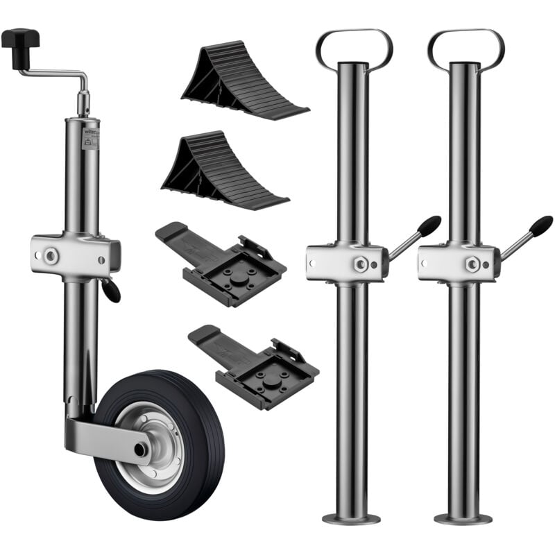 Set completo per rimorchi - - 10 pezzi totali, tra cui ruotino per carrelli appendice, cunei per ruote e piedi stabilizzatori [Capacità di carico 362 kg] - Progettato per sostenere carichi fino a 362 kg, ideale per manovrare e parcheggiare il rimorchio con sicurezza [Piedi stabilizzatori regolabili] - Assicurano stabilità durante carico e scarico, prevenendo il ribaltamento su terreni vari [Servotimone a ruota] - Facilita l'accoppiamento al gancio da traino e mantiene il rimorchio in posizione evitando che si ribalti sul timone [Materiali di alta qualità] - Acciaio zincato resistente alla. ruota in gomma a prova di foratura Questo pratico set di ruotino di supporto per roulotte offre tutto il necessario per parcheggiare correttamente il rimorchio. Il set è composto da un robusto ruotino di supporto, due cunei per ruote con morsetti abbinati, tre morsetti e due supporti di parcheggio. La ruota per rimorchi è ideale per rimorchi di piccole e medie dimensioni, carrelli, caravan e molto