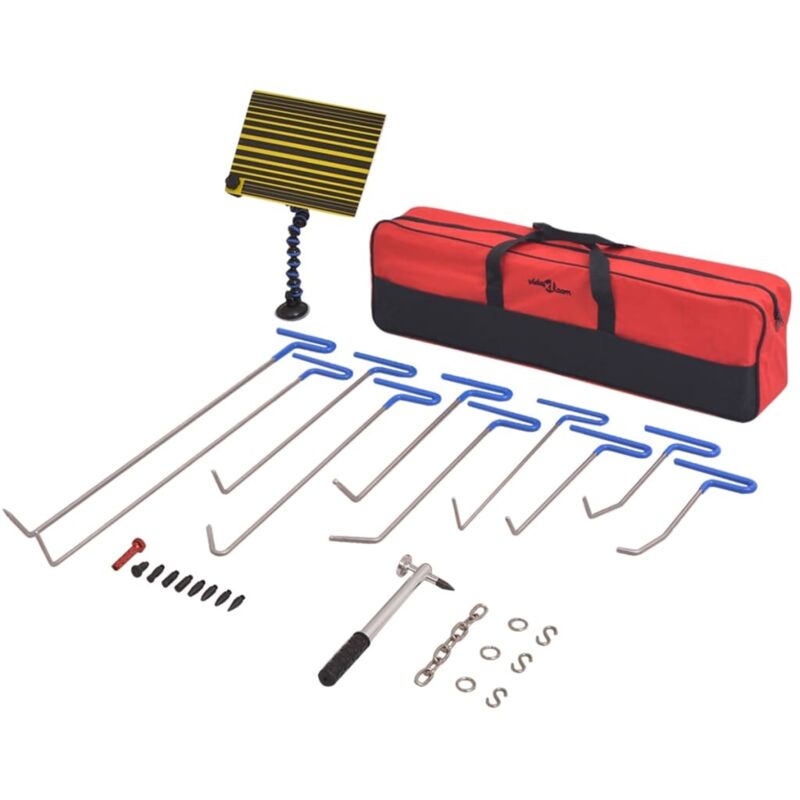Il nostro set in acciaio inossidabile per la riparazione delle ammaccature senza verniciatura rimuove le ammaccature e le deformazioni del veicolo senza danneggiare la verniciatura. L'uso di questo set di strumenti per la rimozione delle ammaccature non danneggerà l'auto come altri metodi. Le ammaccature vengono rimosse dal retro del pannello in modo da non dover carteggiare, utilizzare i riempitivi della vernice (stucco per la carrozzeria) o riverniciare. Nessun pannello dovrà essere sostituito o verniciato, risparmiando il fastidio di miscelare il colore della vernice giusto da abbinare ai pannelli adiacenti. La rimozione delle ammaccature senza verniciatura è un processo delicato e richiede sempre gli strumenti migliori, perciò questo set sarà un'ottima scelta. Il set comprende 10 barre per la rimozione delle ammaccature senza verniciatura, 1 tavola di allineamento con supporto flessibile, 1 strumento abbassa guarnizioni con 8 diverse punte, 1 martello abbassa guarnizioni, 1