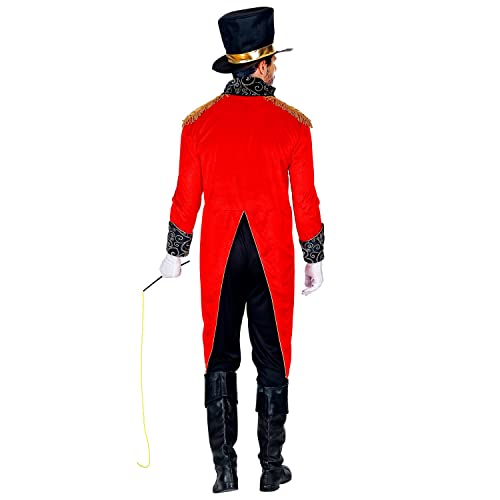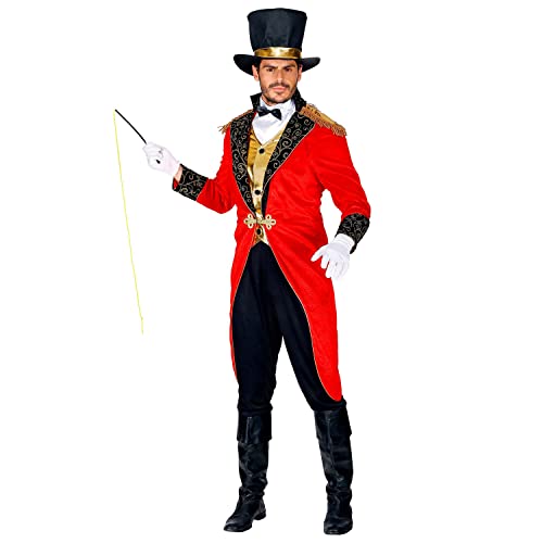 Il set è composto da un frac rosso con gilet, una camicia con colletto e papillon nero, pantaloni neri, un cilindro abbinato e due guanti bianchi. Naturalmente la frusta inclusa nella confezione non può mancare.
