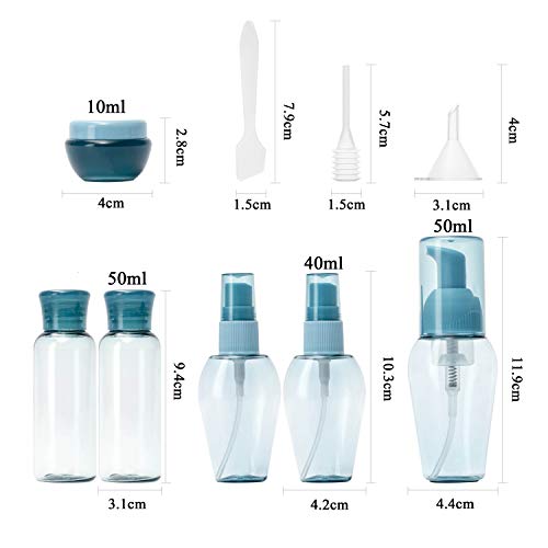 Quantità e dimensioni: 2 bottiglie di liquido (50 ml), 2 flaconi spray (40 ml), 1 bottiglia di pompa per schiuma (50 ml), 1 contenitore per crema (10 ml), 1 imbuto, 1 ventosa, 1 cucchiaio da miscela, 1 borsa per la conservazione. Colore: azzurro, può facilmente guardare quanto è il cosmetico