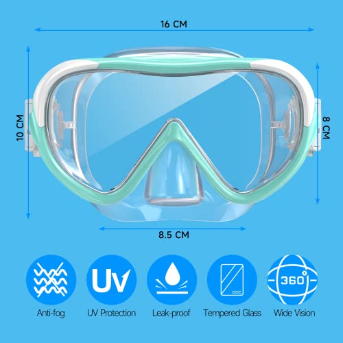 【 Visione chiara a 180° e antiappannamento】 Il design avanzato della forma della lente e il vetro temperato ispessito con il più recente trattamento antiappannamento consentono di ottenere un'esperienza subacquea cristallina senza sfocature o distorsioni. Il design in vetro monopezzo consente una migliore e più ampia visibilità sott'acqua, i vostri bambini potranno godere appieno del mondo subacqueo e divertirsi ancora di più in acqua.