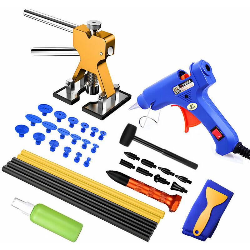 LEVA DEL DENTE: 1. Corpo in alluminio 2. Manopola di regolazione in acciaio inossidabile 3. Dadi/bulloni/asse del perno/fissaggio a E in acciaio inossidabile 4. Una vite sulla parte superiore del dente di sollevamento viene utilizzata per impostare l'altezza media di il dente di sollevamento. 5. Con il processo di ossidazione della levigatura, la sensazione di consistenza liscia e l'aspetto eccezionale, il prodotto è molto resistente e durevole. 6. Nella parte inferiore del sollevatore a denti è presente silicone, non gomma ordinaria, che è molto morbida e non dannosa per la pittura ad olio e può essere demolita. Come usare? 1, urto causato da collisione, graffio, schiacciamento. 2, scegli una linguetta che corrisponda alla forma e alle dimensioni dell'ammaccatura. Applicare la colla a caldo al centro del rubinetto e il cerchio all'interno e all'esterno e assicurarsi che la colla sia uniforme e piena sul rubinetto. 3, Allineare il punto medio della linguetta con il punto medio