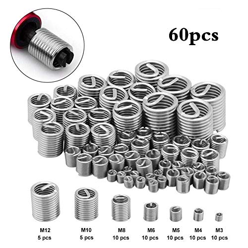 Kit di riparazione filettatura in acciaio inossidabile, inserto per riparazione filettatura metallica, inserto filettato autofilettante M3 M4 M5 M6 M8 M10 M12 per riparazioni automobilistiche, 60 pez