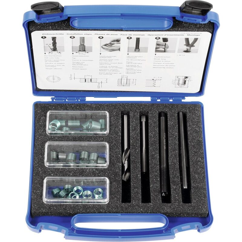 Inserti filettati continui HeliCoil®plus ad alta resistenza, in acciaio legato con elevata resistenza all'usura, ridotto attrito della filettatura all'interno di tolleranze minime, alta qualità di finitura delle superfici nonché resistenza alla corrosione e al calore. La struttura flessibile consente di ripartire in modo uniforme il carico e la tensione, assicurando al contempo collegamenti a vite durevoli di altissima qualità per tutti i carichi di lavoro (statici, dinamici) con trasmissione ideale del momento torcente. Montaggio semplice e rapido, in tal modo si forma una filettatura interna precisa, utilizzabile da ambo i lati. Set di riparazione completo per una misura di filetto metrica cad. in valigetta di plastica. Uso: Per la riparazione economica di filettature danneggiate o usurate e come elemento di costruzione per l'armatura delle filettature di materiali con ridotta resistenza al taglio (per es. alluminio, leghe di alluminio e magnesio). Fornitura: * 1 maschio a